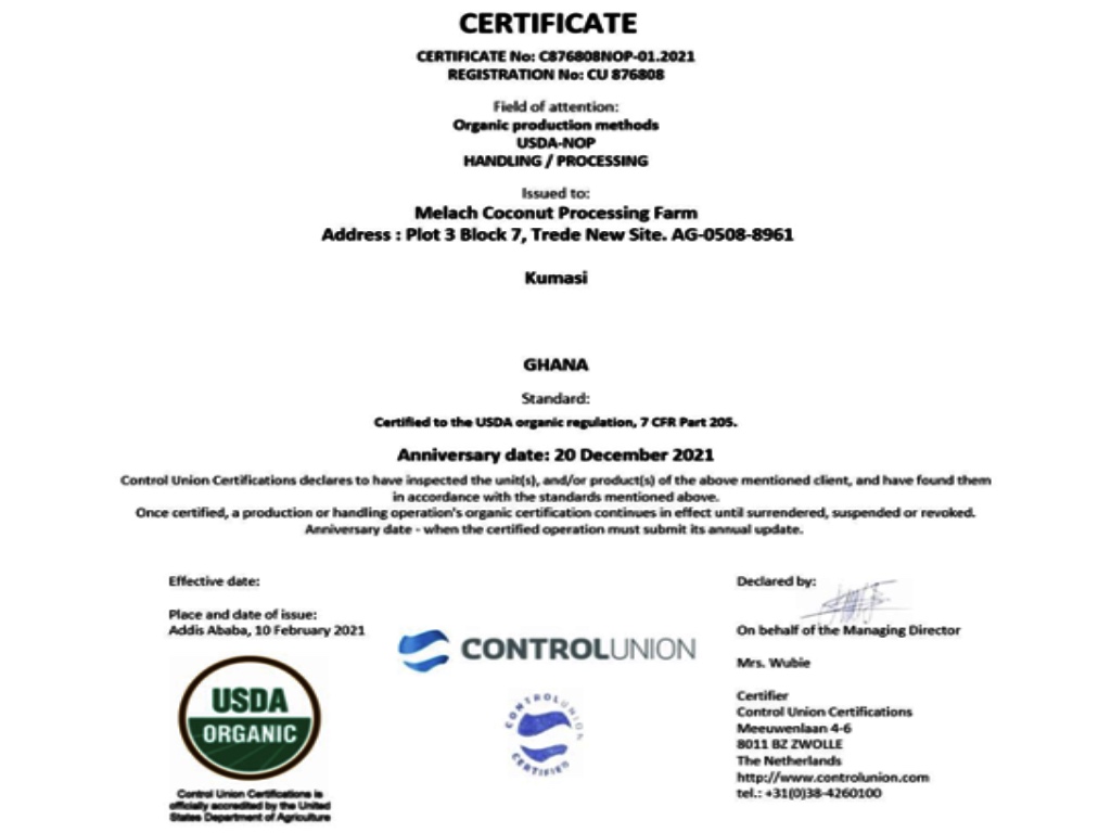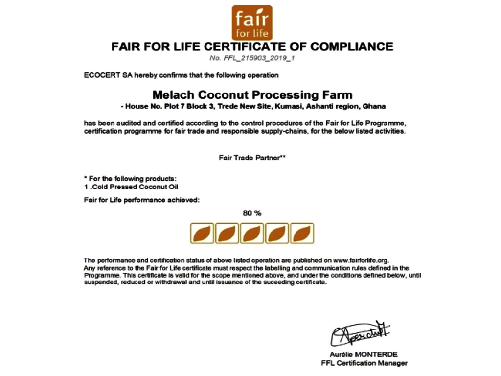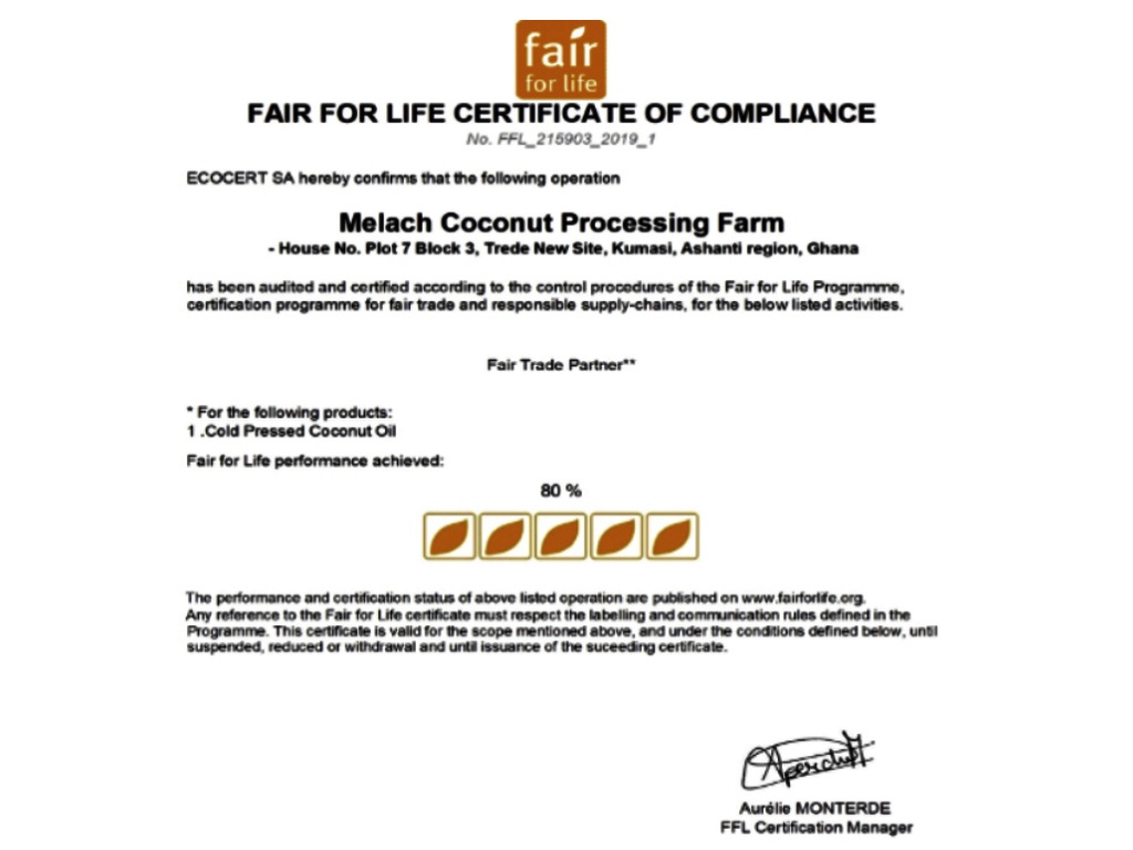 We were introduced to a US based cosmetic industry called ALAFFIA from Olympia, USA who signed a purchase agreement with Melach Coconut Processing Farm to supply them FAIR FOR LIFE CERTIFIED & ORGANIC CERTIFIED virgin coconut oil, Fresh Coconut Water.